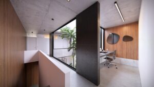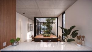 At the heart of the house lies an indoor garden that connects both floors, allowing natural light and ventilation to flow gently through the spaces, creating a sense of lightness and well-being everywhere.