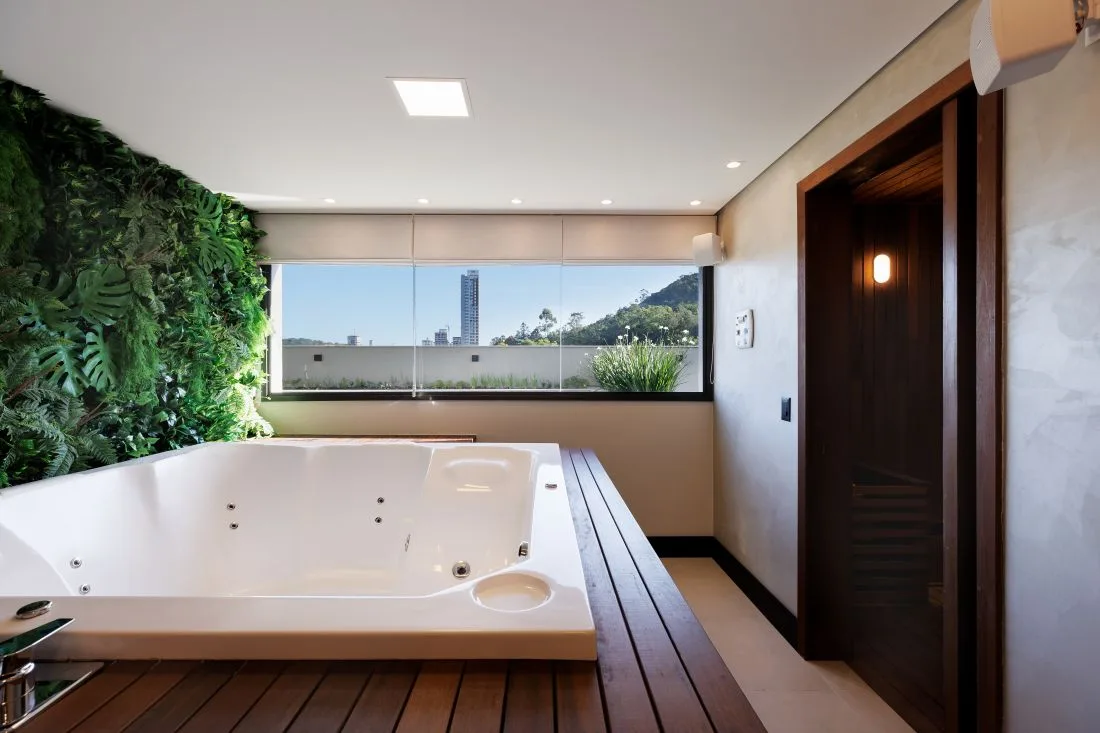 Brava Garden Home Club comprises two 21-storey towers designed by CN Empreendimentos, each serviced by dual elevators and backup generator systems. The development’s 2,500 m² leisure platform spans both towers: a rooftop spa with panoramic decks, dual swimming pools, a fully equipped gymnasium, padel court, co-working studios, wine bar, garage band rehearsal space, and dedicated children’s club. Social and service access routes ensure privacy for residents and guests alike.