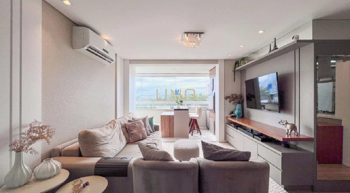 Spanning 122.75 m² of private living space within a 159.59 m² total footprint, this three-bedroom, three-bathroom apartment at Residencial Gran Classic exemplifies contemporary Brazilian condominium living. The residence has been thoughtfully decorated to showcase the efficient floor plan, which accommodates both family living and executive hosting with equal grace.