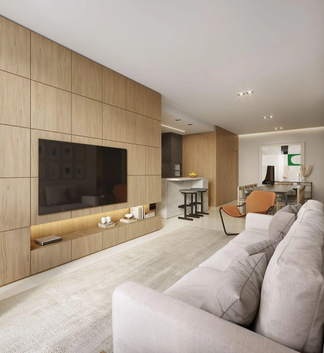 This 145 m² residence on the ninth floor comprises four suites and five bathrooms, configured to maximize natural light and spatial efficiency. The layout includes expansive living and dining areas, a gourmet kitchen, and a private balcony equipped with a charcoal grill. Floor-to-ceiling Schüco aluminum frames with 12 mm glass panels ensure acoustic insulation and thermal performance, while porcelain flooring in 90×90 cm format extends throughout the interior.