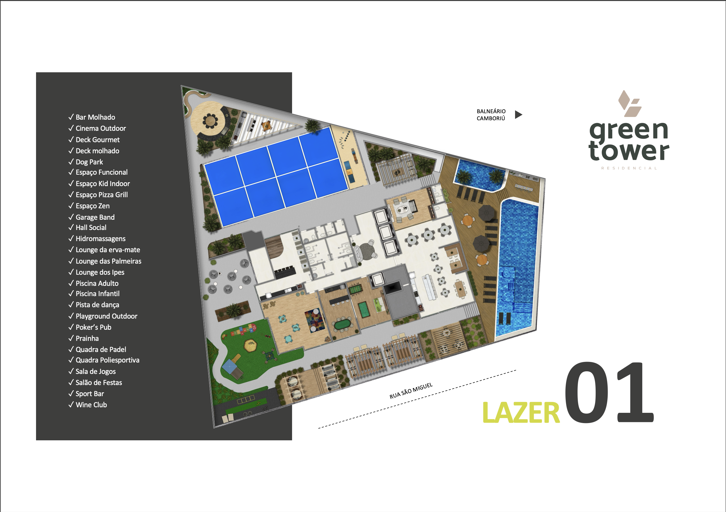 Bar molhado, outdoor cinema, gourmet deck, pools, dog park, kids indoor, zen areas, lounges, padel court, sports court, games room, events hall, wine club & more.