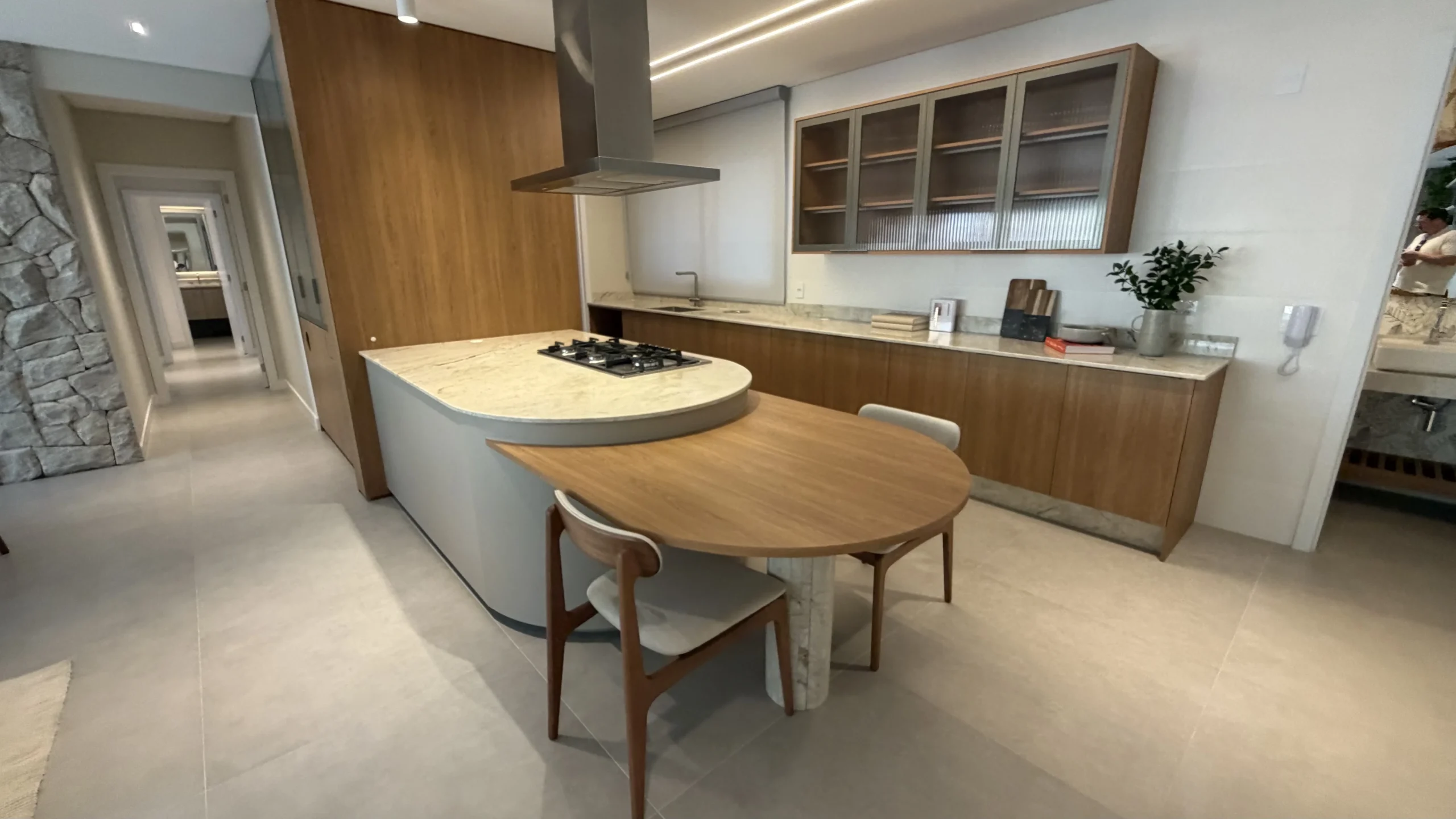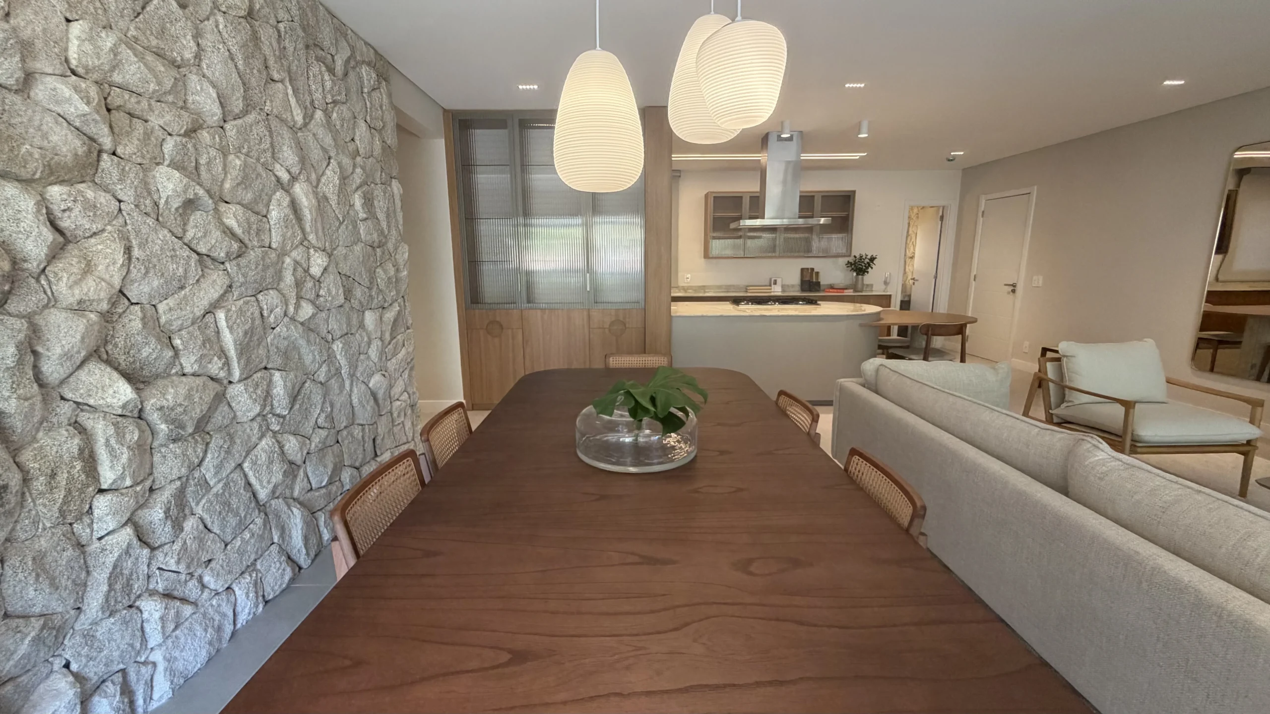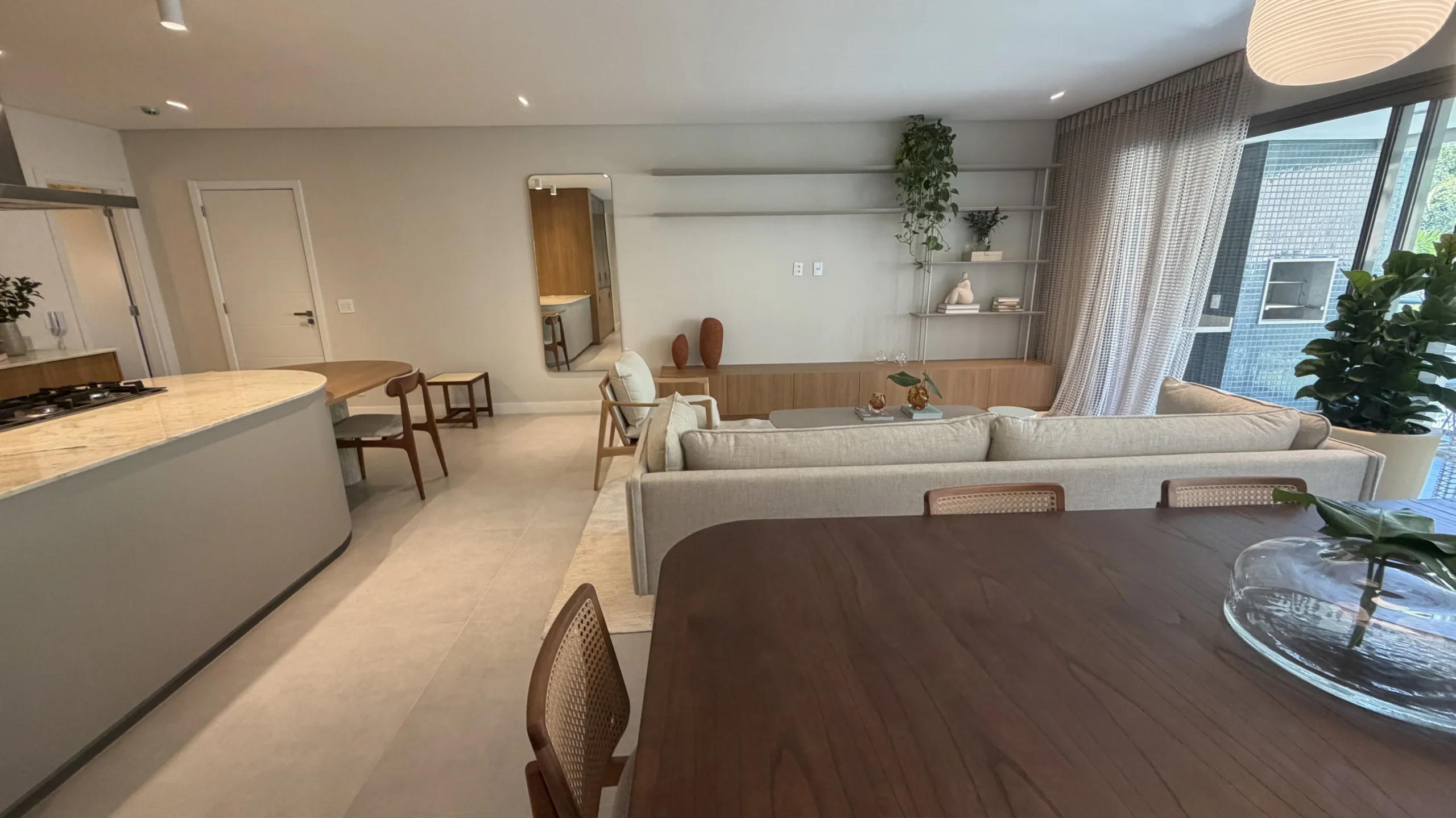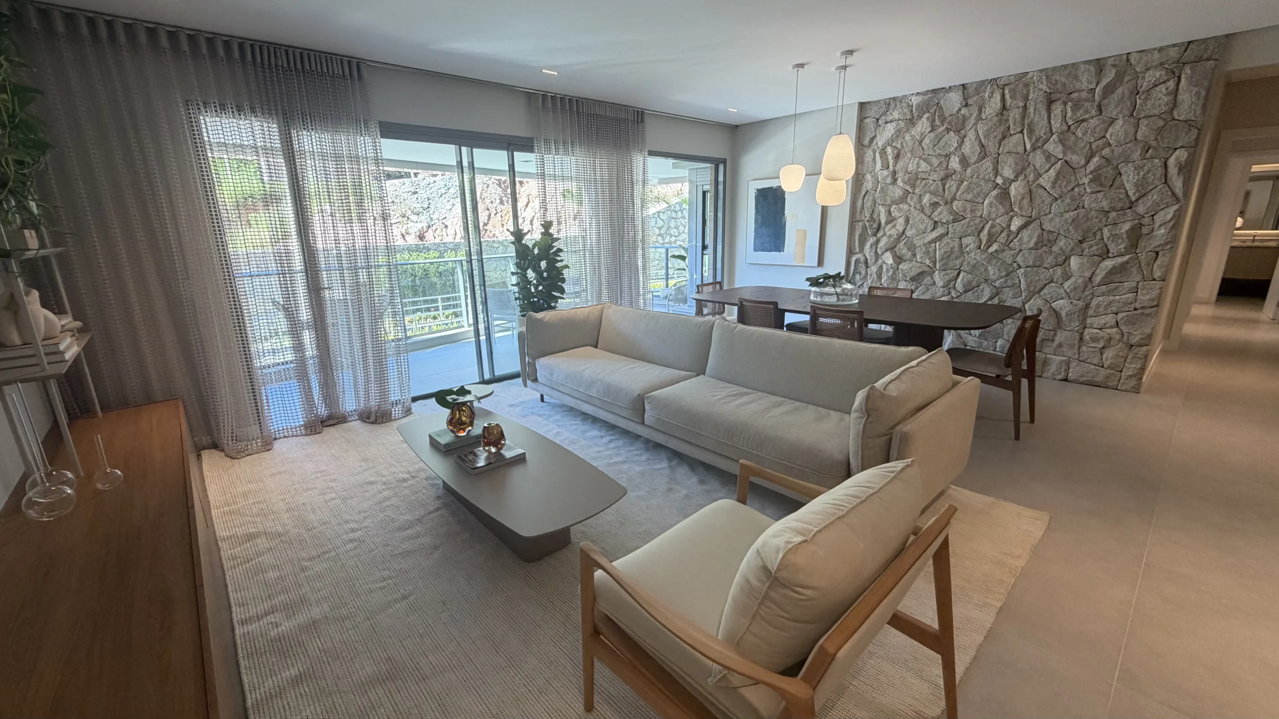 Miragio Cacupé’s condominium infrastructure includes a fitness facility, coworking lounge, function room with catering kitchen, and dedicated pet amenities. The development’s architecture draws from the island’s natural topography, integrating low-density towers within preserved Atlantic Forest corridors.