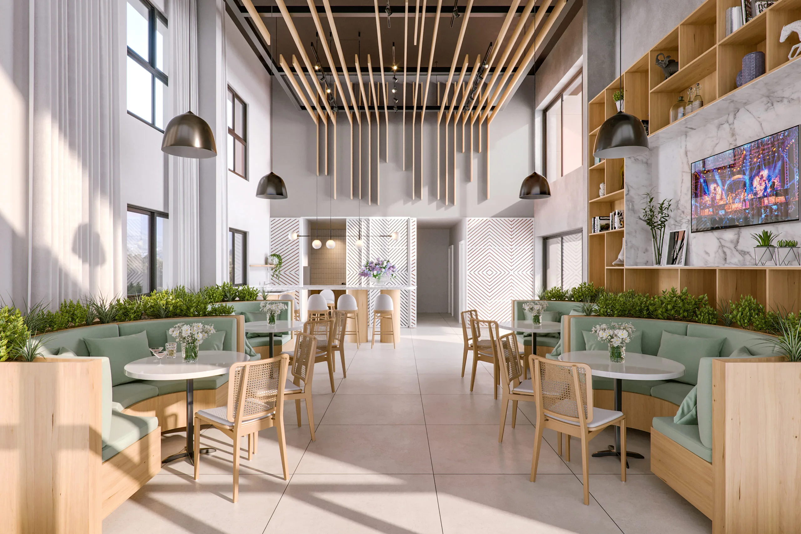 Mobby’s amenity suite includes a panoramic rooftop pool, poolside bar and lounge, beach-style solarium, integrated gourmet terrace with fire pit plaza, fitness centre, co-working facilities, laundry services, pub, and dedicated event space. The architecture prioritises communal lifestyle infrastructure — a strategic asset for short-term rental performance and tenant retention.