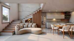 Step inside and be greeted by a double-height ceiling that makes the space feel expansive, paired with a floating staircase that seems to defy gravity. The floor-to-ceiling front windows bathe the house in natural light, perfect for those who appreciate modern, open-concept living.