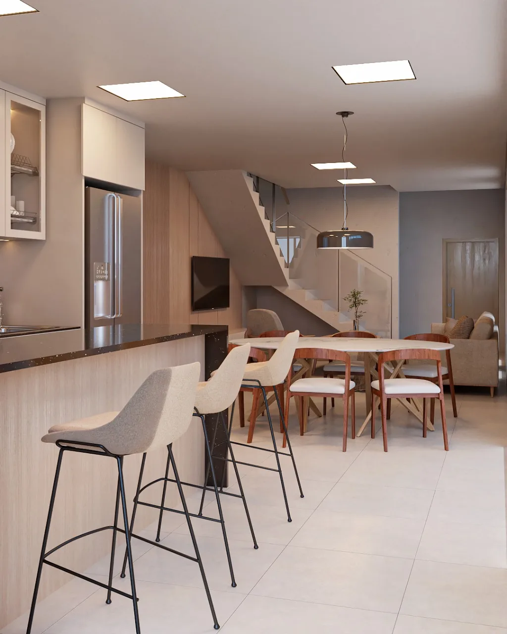 This 142 m² townhouse occupies a privileged position within a low-density residential enclave in Vargem Pequena, delivering both functional design and investment pragmatism. The ground floor presents an open-plan living and kitchen arrangement in a rectangular configuration, maximising spatial efficiency. A dedicated laundry zone ensures operational discretion, while the rear balcony—complete with barbecue infrastructure—overlooks a private garden plot bordered by a permanent preservation area.