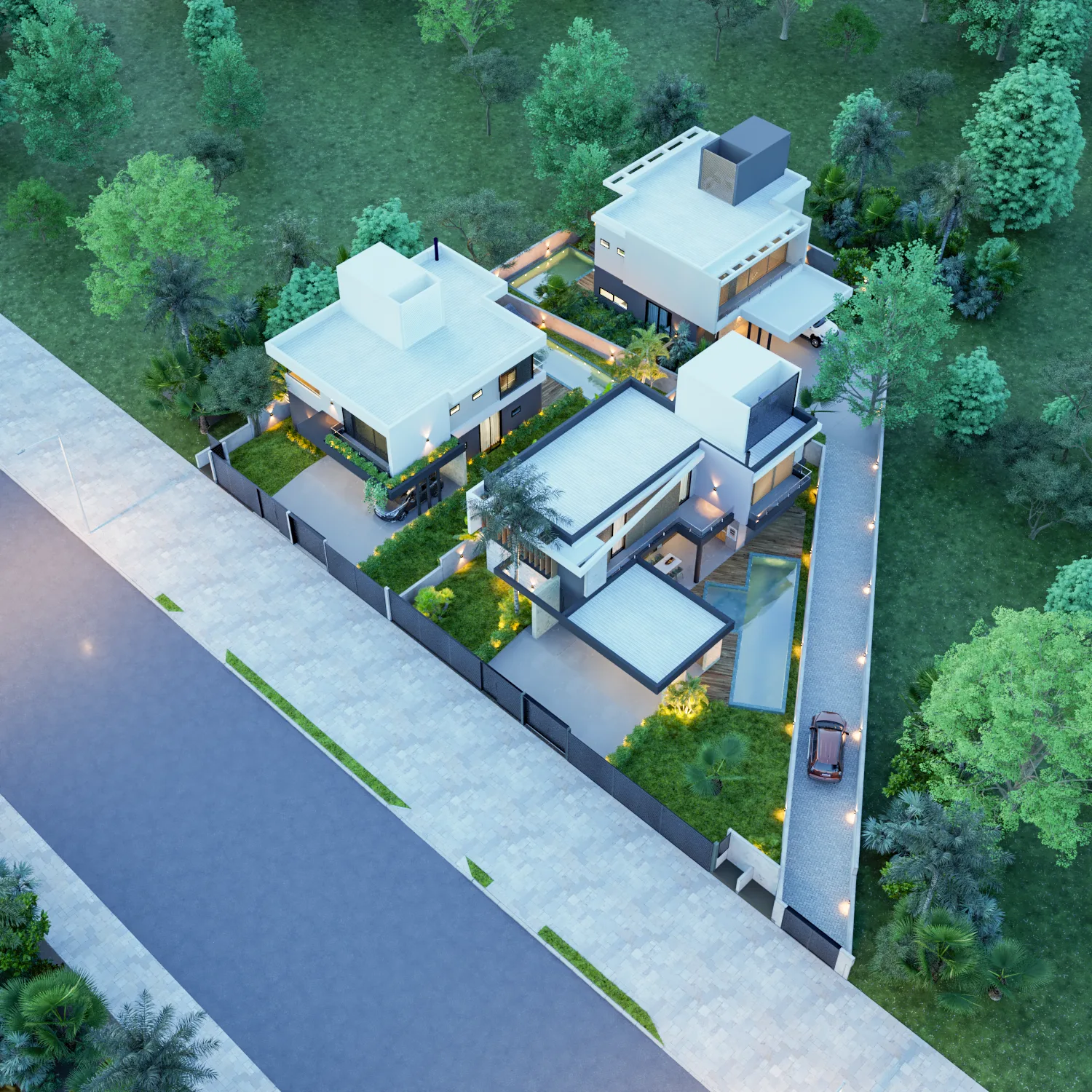 Both homes feature private swimming pools framed by gourmet barbecue terraces, while expansive rooftop decks—ranging from 58 to 83 m²—deliver panoramic vistas over native Atlantic Forest canopy and coastal horizons. Two covered garage bays per residence include EV charging infrastructure and central vacuum systems. Smart home automation, solar panel readiness, and landscaped indigenous plantings underscore a commitment to sustainable luxury.