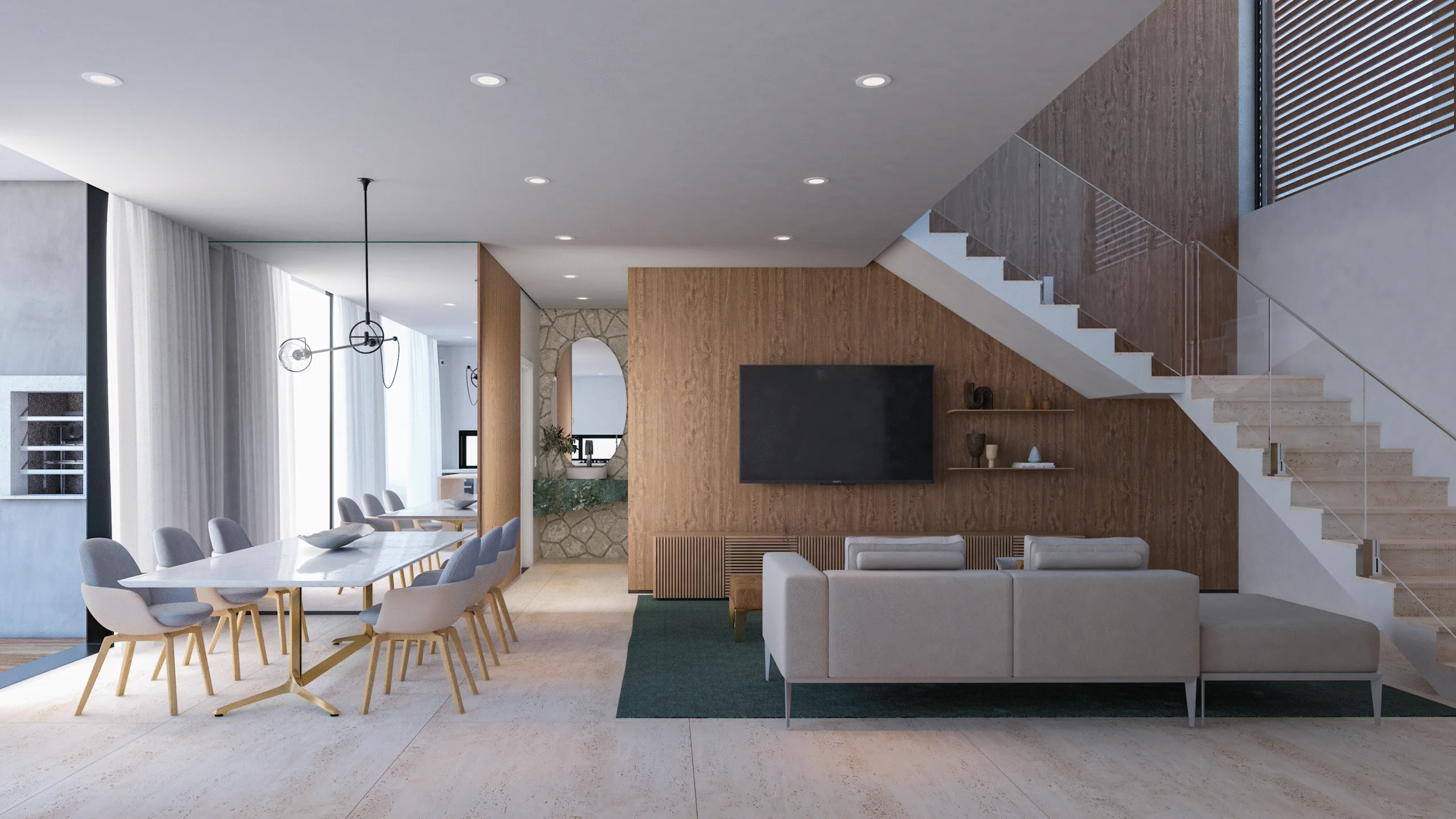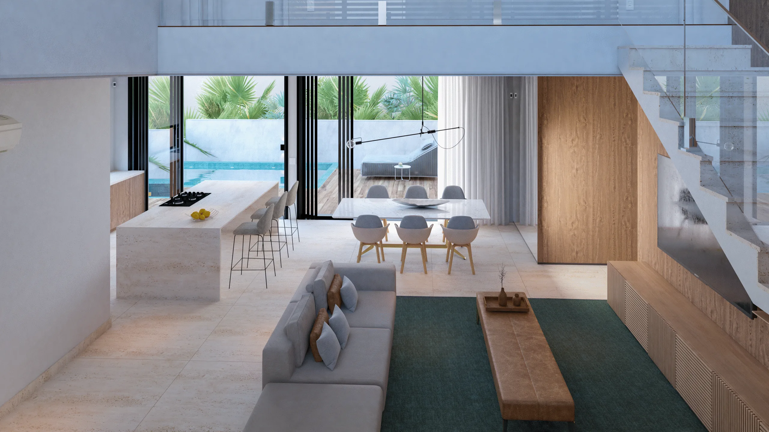 The Silvio Lopes Project comprises two standalone residences positioned on a discreet, surveilled street in Rio Tavares—500 metres from Praia do Campeche via a protected ecological corridor. Each villa presents 317–324 m² of private area across four en-suite bedrooms, double-height integrated living and dining volumes, and contemporary kitchens appointed for discerning use. Floor-to-ceiling glazing and PVC acoustic frames ensure uninterrupted natural light without compromising tranquillity.