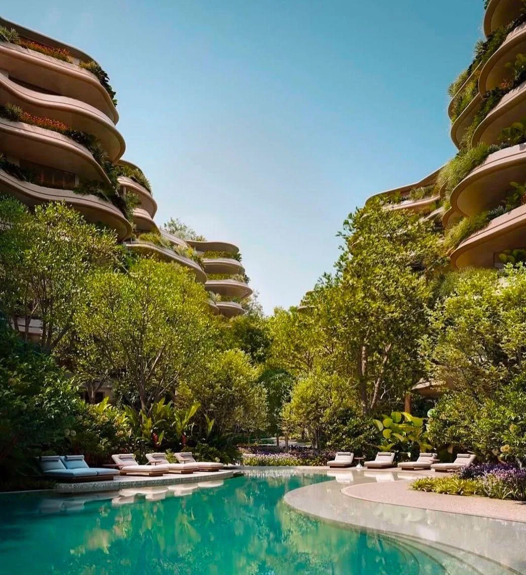 The development comprises 83 residences ranging from 400 m² to 1,200 m², alongside a 47-suite Hemiliano six-star hotel. A landscaped central garden anchors the complex, with infinity pools, water features, and walking trails threading through native vegetation. Rooftop amenities include fitness facilities, wellness areas, and gourmet dining venues managed by the hotel operator. The architecture is designed as a natural amphitheater, with each tower positioned to maximize privacy and unobstructed views.