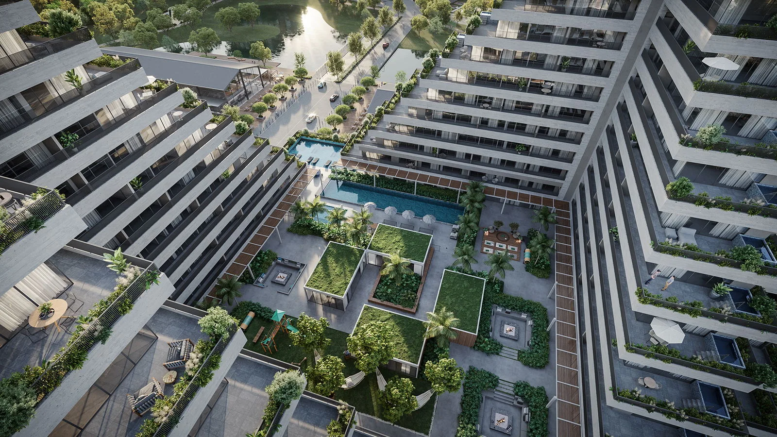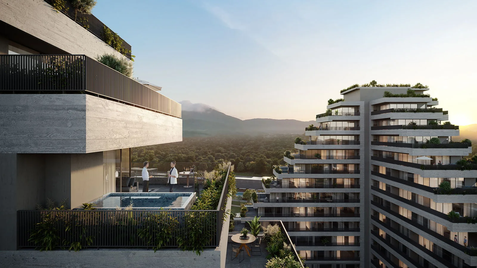 Vértice distinguishes itself through an unusual depth of amenities: a heated indoor pool, 112 m² lap pool, zen garden courtyards, soundproof music studio, and integrated coworking infrastructure with café lounge and commercial-grade meeting facilities. Ground-level retail promenades and an adjacent gastronomic market provide walkable access to dining, services, and daily conveniences—rare in developments of this scale.