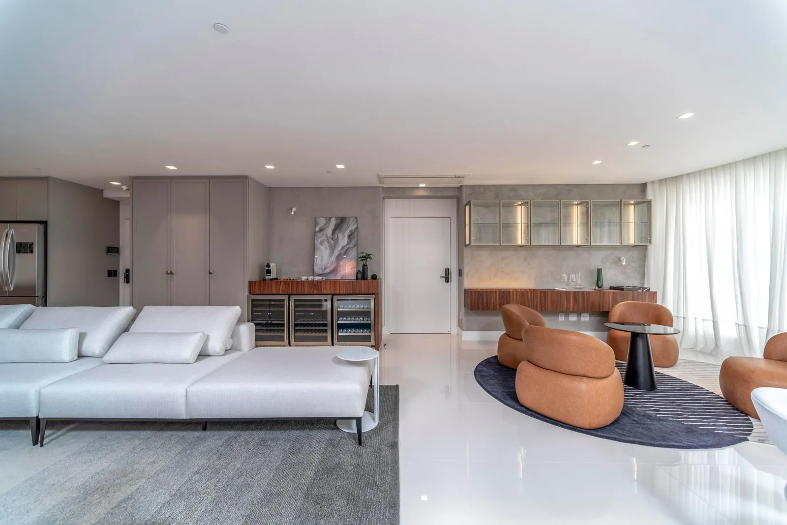 This 261 m² residence occupies the 24th floor of Yachthouse by Pininfarina’s Tower 1, a landmark collaboration between Pasqualotto Construtora and the legendary Italian design house. The apartment unfolds across 80.57 m² of private suites, 73.10 m² of integrated living space, and 33.5 m² of service quarters, all framed by floor-to-ceiling glass that captures unobstructed views of the Interpraias coastline, the Camboriú River, and the adjacent Marina Tedesco.