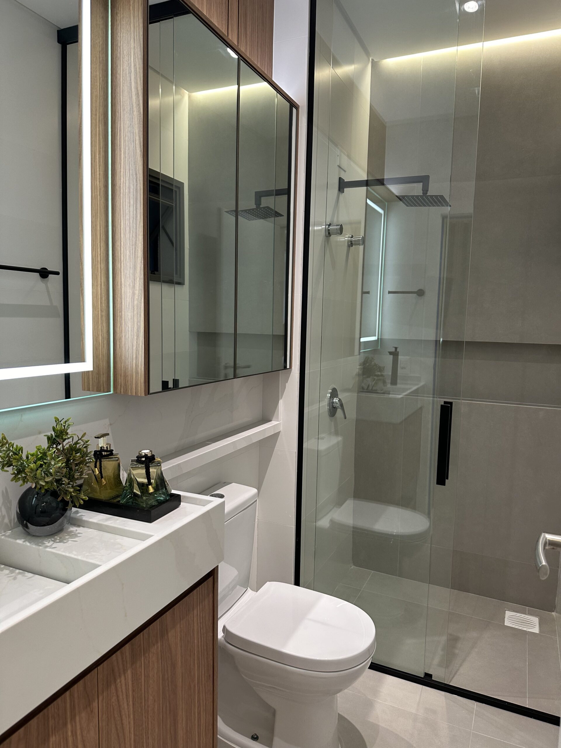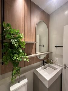 O apartamento possui dois dormitórios — sendo um deles suíte — ambos com acesso direto ao garden privativo, perfeito para yoga matinal, exercícios ao ar livre ou simplesmente para curtir o ar fresco. A área externa também conta com um deck ideal para receber amigos, além de uma churrasqueira com pia.
